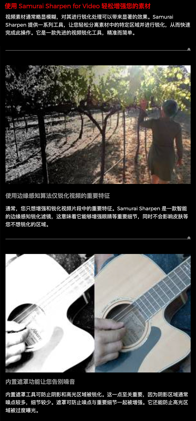 视频片段通常有点柔和,增强它以锐化某些细节可以让世界变得不同。Samurai Sharpen 允许您使用旨在让您轻松隔离素材的特定区域并仅锐化这些区域的工具来快速完成此操作。它是最先进的视频素材锐化技术,既精确又简单。