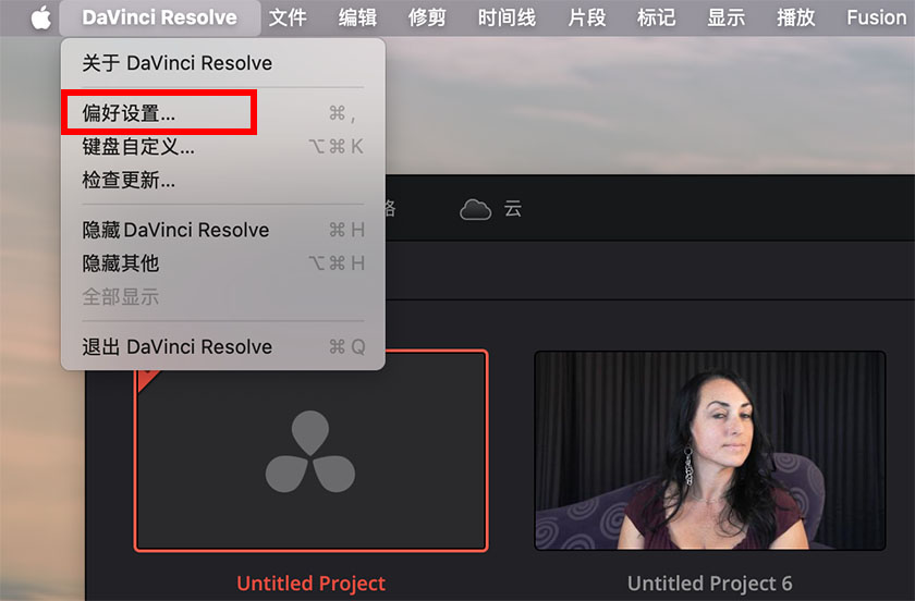 1、达芬奇软件打开,查看右上角菜单,偏好设置。