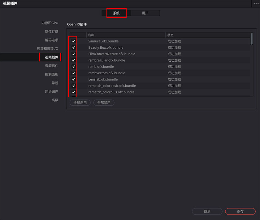 2、检查 偏好设置-系统-视频插件,安装的插件是否打勾 ✅ 成功加载。