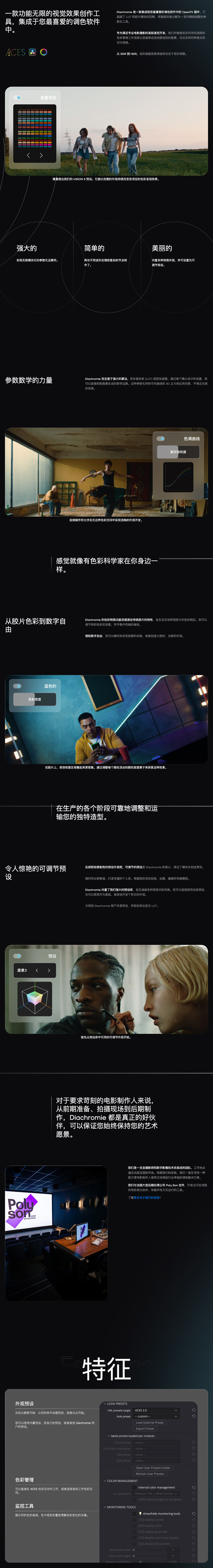 Diachromie 是一款集成到您最喜爱的调色软件中的 OpenFX 插件。它超越了 LUT 和胶片模拟的范畴,将画面风格分解为一系列精细调整的参数化工具。专为满足专业电影摄影的高标准而开发,我们的智能色彩科学和透明的色彩管理工作流程让您能够自信地塑造您的愿景,无论采用何种格式和交付规格。从 SDR 到 HDR,您的画面效果将始终忠实于您的预期。