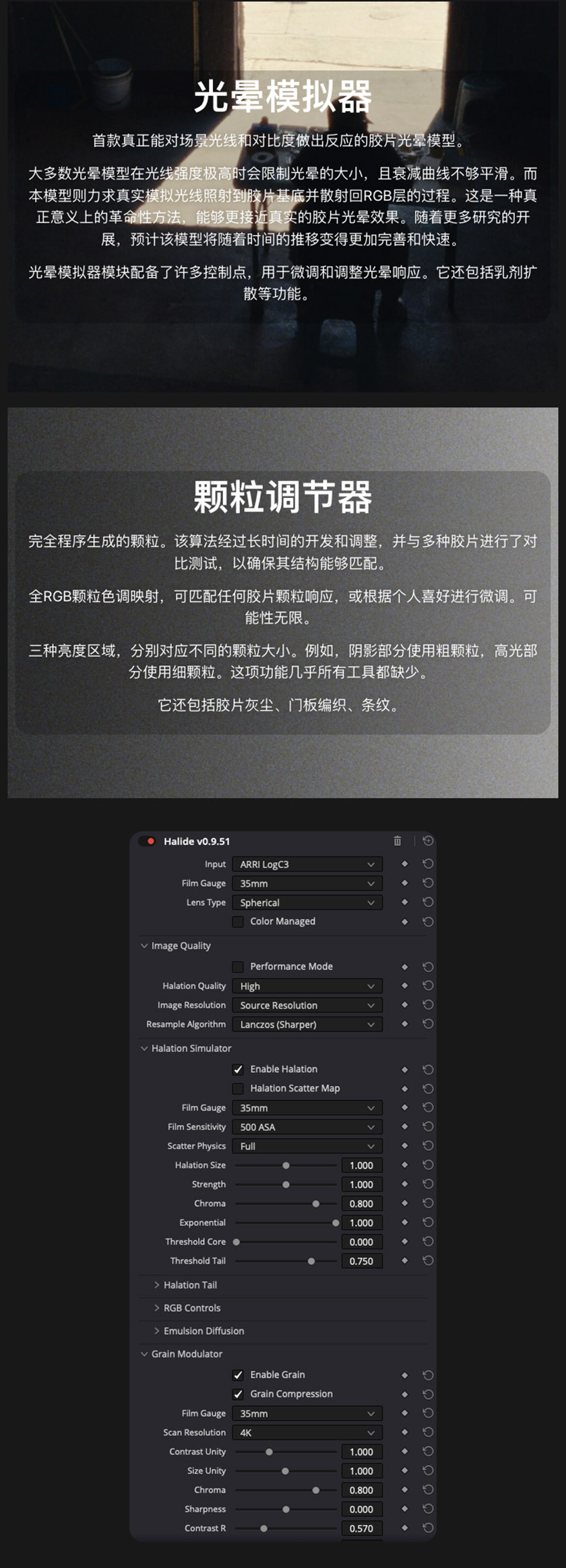 首款真正能对场景光线和对比度做出反应的胶片光晕模型。 大多数光晕模型在光线强度极高时会限制光晕的大小,且衰减曲线不够平滑。而本模型则力求真实模拟光线照射到胶片基底并散射回RGB层的过程。这是一种真正意义上的革命性方法,能够更接近真实的胶片光晕效果。随着更多研究的开展,预计该模型将随着时间的推移变得更加完善和快速。光晕模拟器模块配备了许多控制点,用于微调和调整光晕响应。它还包括乳剂扩散等功能。