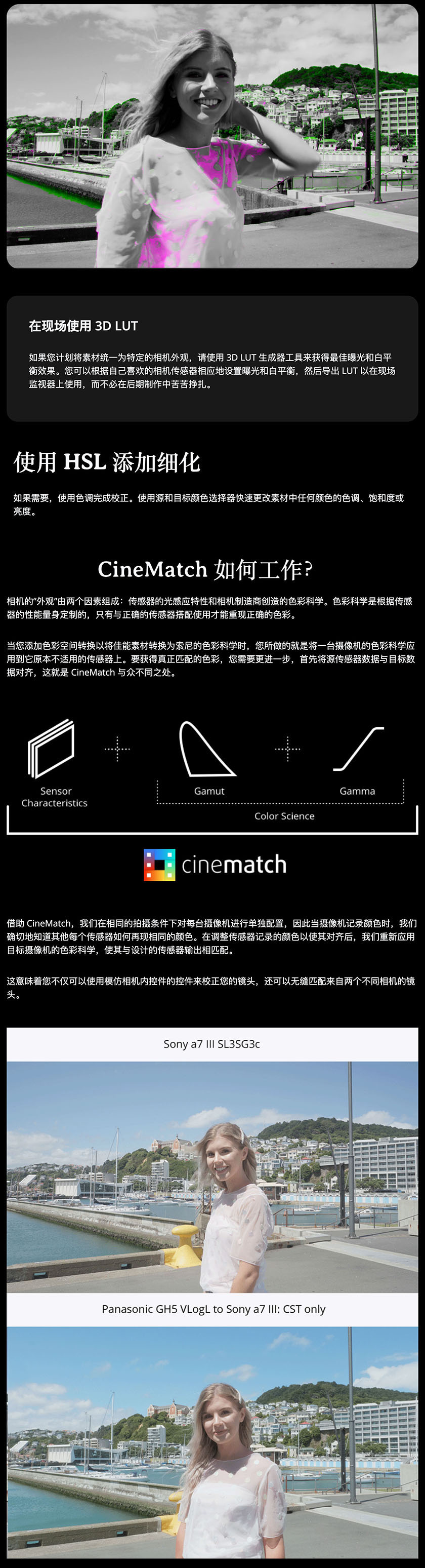 CineMatch 是适用于所有电影制作人的快速、简单的颜色分级解决方案。匹配来自 70 多种相机品牌和型号的镜头,使用类似 RAW 的控件来校正您的素材,只需单击一下即可应用 REC.709 转换。