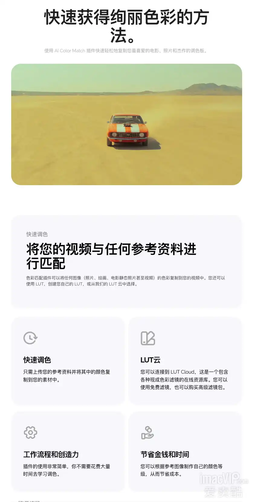 该软件会分析源图像和参考图像的配色方案,并将素材转换为所需的配色方案。参考图像存储在视频项目中,之后可以轻松更改。它还可以访问 LUT Cloud,适用于 MacOS 的 Final Cut 插件。