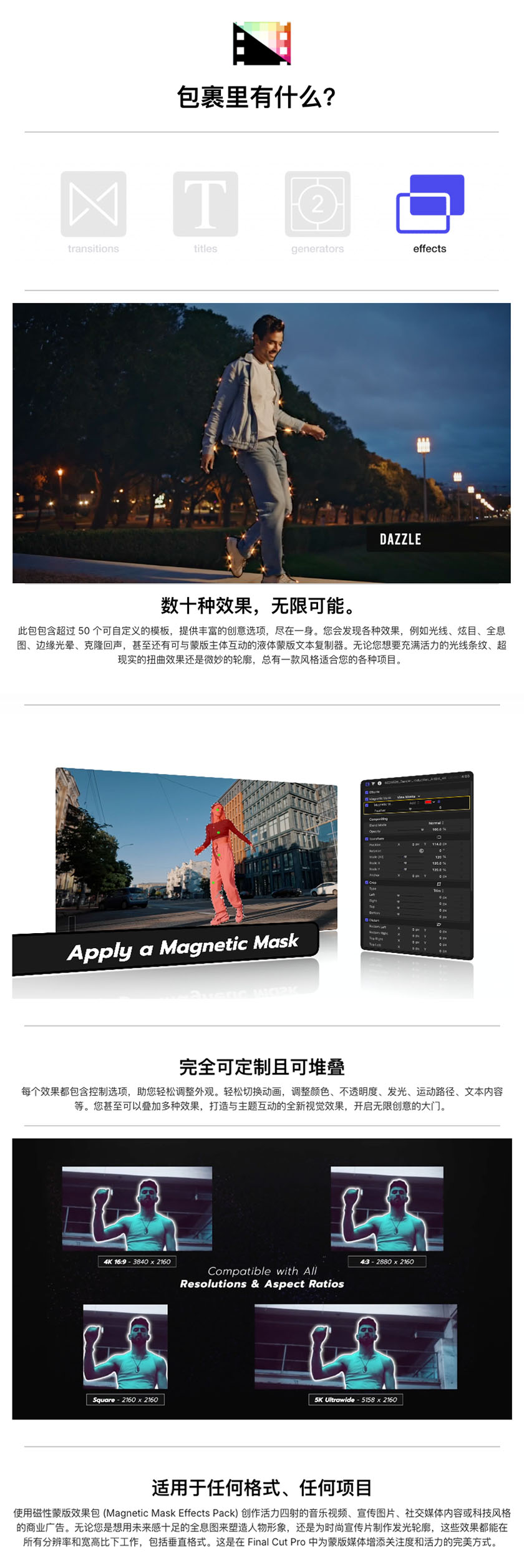 插件包含了50组磁性蒙版效果,一套强大的视觉增强工具。这款插件专为使用 Final Cut Pro 的磁性蒙版功能隔离主体的剪辑而设计,可让您将惊艳的效果直接应用于人物、物体或任何被蒙版遮罩的主体。添加发光轮廓、动态阴影、闪烁灯光效果等,打造引人注目的动态视觉效果。