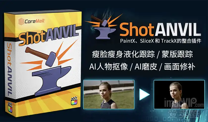 插件包含了CoreMelt ShotAnvil是一款功能强大的插件,它将跟踪绘画、蒙版和图形插入与一键式 AI 人物抠像功能结合在一起,全部集成在一个插件中。ShotAnvil 经常更新强大的新工具、模板和教程。最新版本包括AI 驱动的轮廓和轮廓效果、跟踪天空插入等。