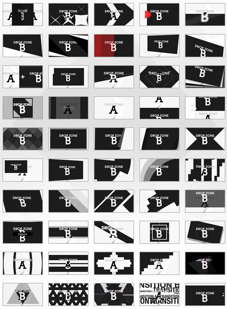 一共50组简单图形动画视频转场预设,可以调节转场的颜色,直接拖到两个视频中间即可,使用简单,支持到4K