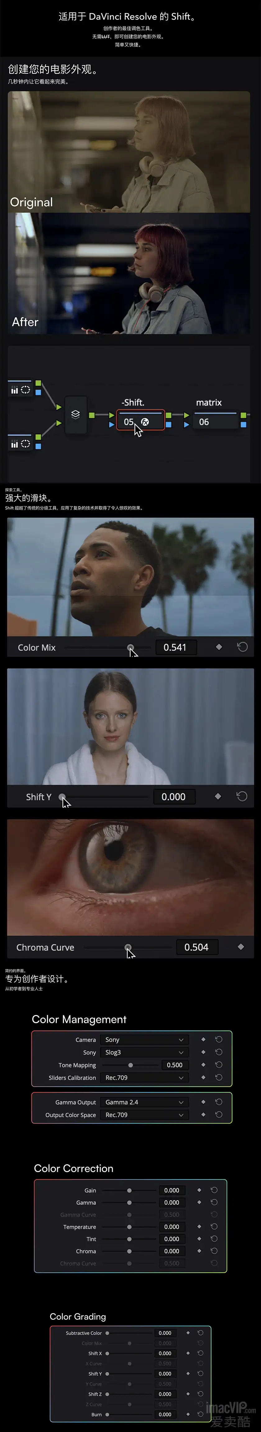 插件包含了创作者的最佳调色工具。无需LUT,即可创建您的电影外观。简单又快捷。创建您的电影外观。几秒钟内让它看起来完美。支持所有相机。索尼、佳能、松下、富士、黑魔法、大疆、尼康、徕卡、iPhone、RED、ARRI……