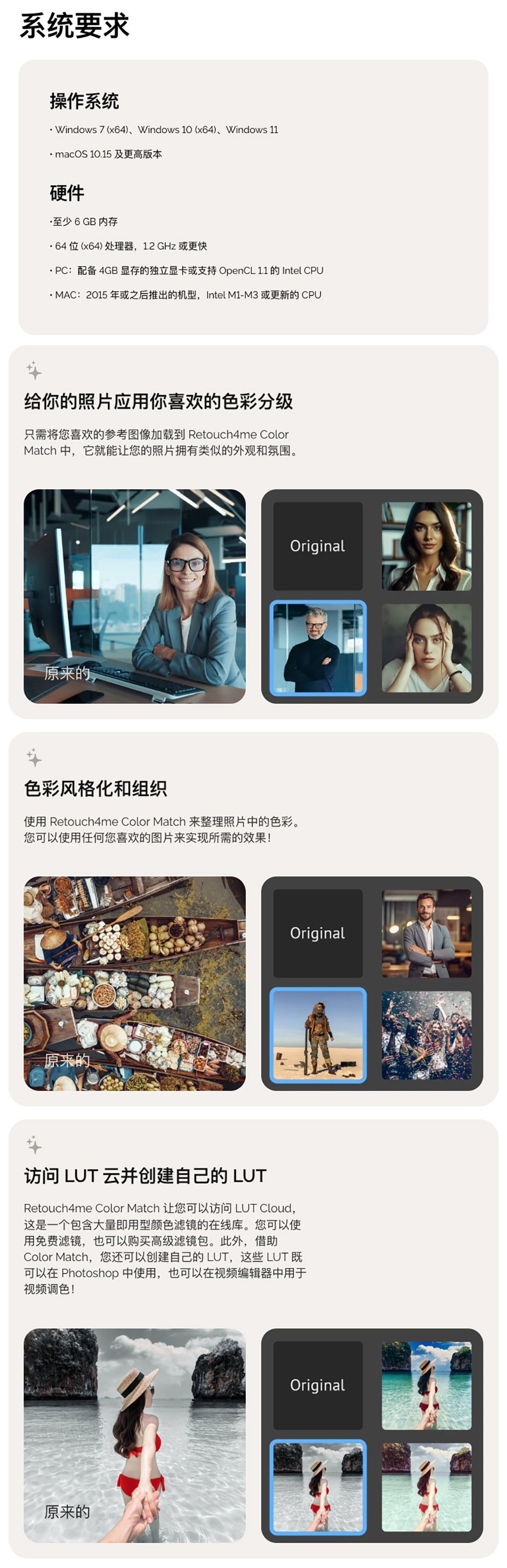 该软件分析源图像和参考图像的色彩方案,并将您的图像转换为匹配所需的色彩方案。它还提供对 LUT 云的访问,内含数百种免费的 LUT。您可以将结果导出为 LUT,用于照片和视频的调色。 Photoshop 插件及适用于 Windows 和 MacOS 的独立软件。