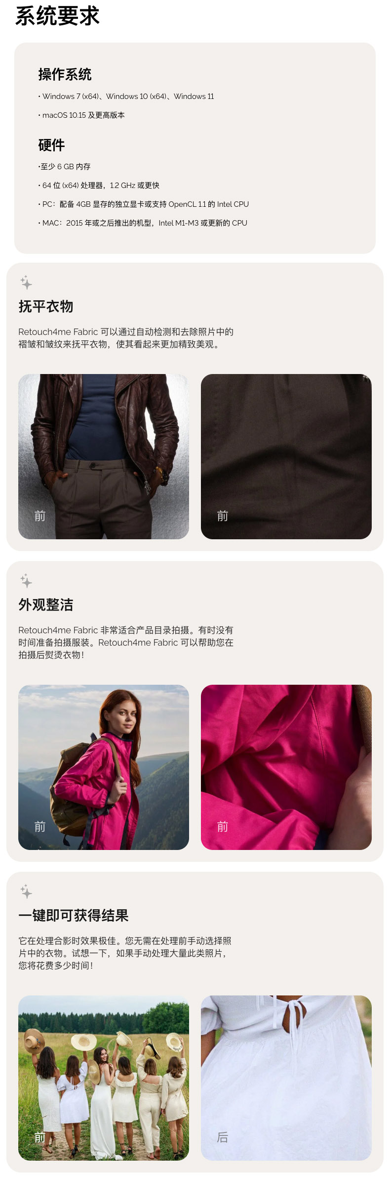 AI 智能去除衣物褶皱,特别适合活动中的合影照片。 作为 Photoshop 滤镜使用,结果以图层呈现,在照片上自动识别衣物并抚平褶皱和皱纹。可作为 Photoshop 插件使用,也可作为独立程序运行。