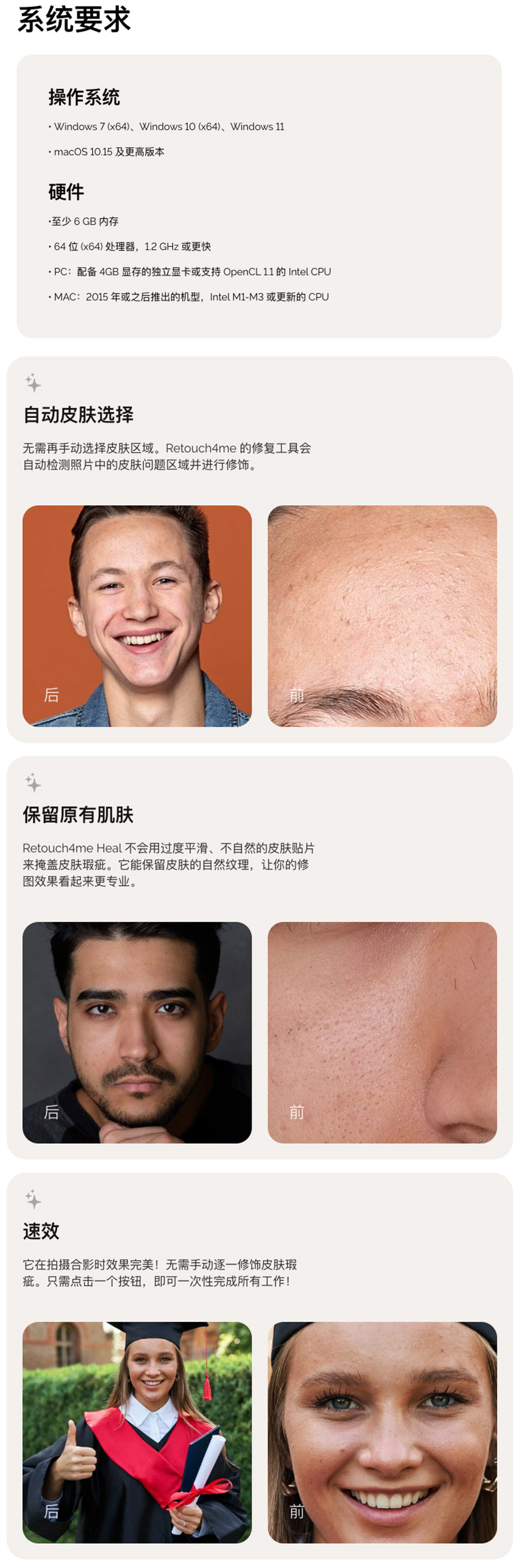 去除全身粉刺和细小皮肤瑕疵。AI 如专业修图师般操作,保留自然肌理。 作为 Photoshop 滤镜使用,结果呈现为图层,自动修正,保护皮肤结构。其工作原理如同 Photoshop 的插件,也可以作为独立程序使用。