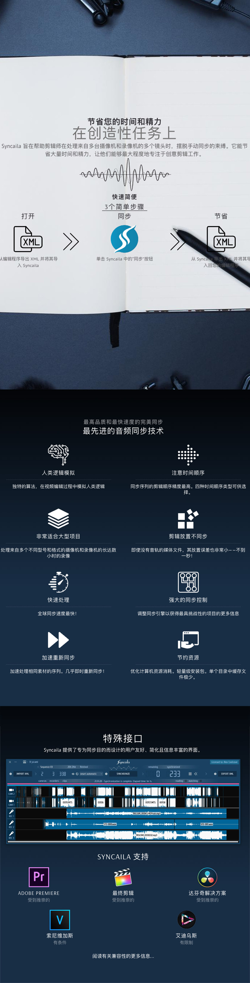 Syncaila 旨在帮助剪辑师在处理来自多台摄像机和录像机的多个镜头时,摆脱手动同步的束缚。它能节省大量时间和精力,让他们能够最大程度地专注于创意剪辑工作。